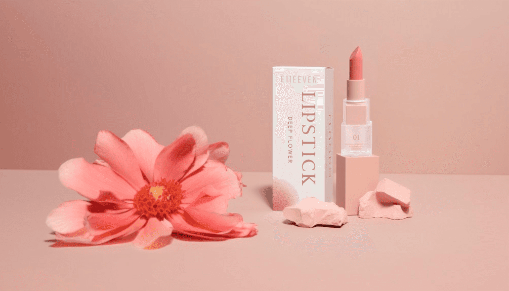 The third aesthetic for the Elleven label is marked by its tender, subtle design adorned with peach hues and splatterings of watercolor. This method lends the label a soft, creative edge, enticing those customers who appreciate cosmetic goods brimming with a love-struck and illustrative appeal.